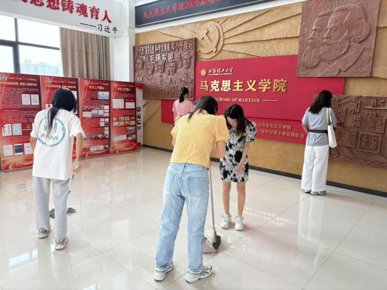 离校前夕,支部毕业生党员们自发组织起来,主动打扫“红色会客厅”,大家不仅清洁了学院环境,也在劳动中重温了光荣革命传统,以实际行动诠释了党员的责任与担当。