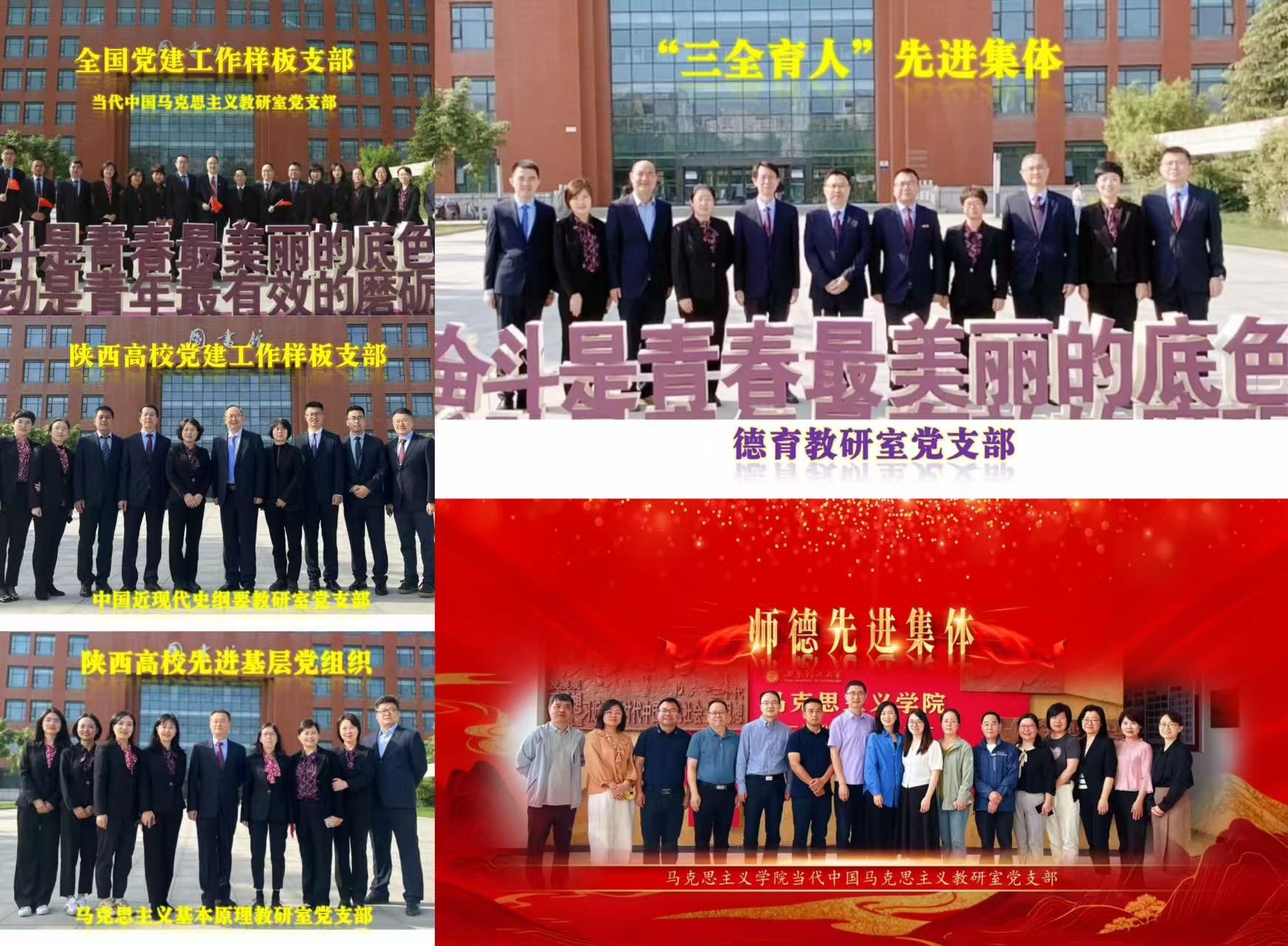 公司为陕西省师德建设示范团队,公司党委连续6年获校先进基层党组织,连续获校“三全育人”先进集体。4个教职工党支部全部为校级党建工作样板支部,其中3个分别为全国党建工作样板支部(2024年通过验收)、陕西省高公司党建工作样板支部(2022年通过验收)、陕西省高校先进基层党组织。入围全国高校“活力团支部TOP100”1个。获全国高校思政工作“金微课”二等奖、优秀奖、优秀组织奖。获陕西省思想政治工作优秀案例、陕西省思想政治工作优秀研究成果4项。1人当选陕西省第十四次党代会代表,6人次获全国优秀教师、陕西省优秀共产党员、陕西省高校优秀共产党员、陕西省思想政治工作先进个人、陕西省教书育人楷模、陕西省巾帼建功标兵称号。上级领导多次来院调研,对相关工作予以充分肯定。