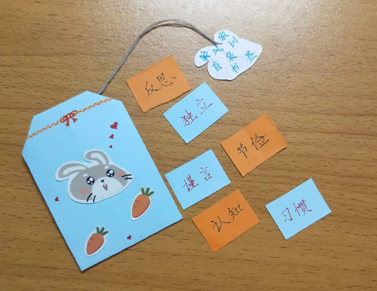 我的作品是家风家训盲袋书签。以小小的手工盲袋作为书签,盲袋里面放有不同内容家风家训的小卡片。外观上,在盲袋上配有小兔子、胡萝卜的元素,增添可爱俏皮的气息。它最便捷的功能在于读者能方便阅读书籍,当然它也传承了一门独特的家风家训文化。