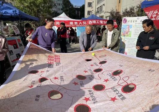 在互动游戏环节,“重走长征路”吸引了各个年龄层的参与者,大家通过游戏体会到了革命先辈们长征的艰辛,感受到了今天幸福生活的来之不易,浓浓爱国之情油然而生。