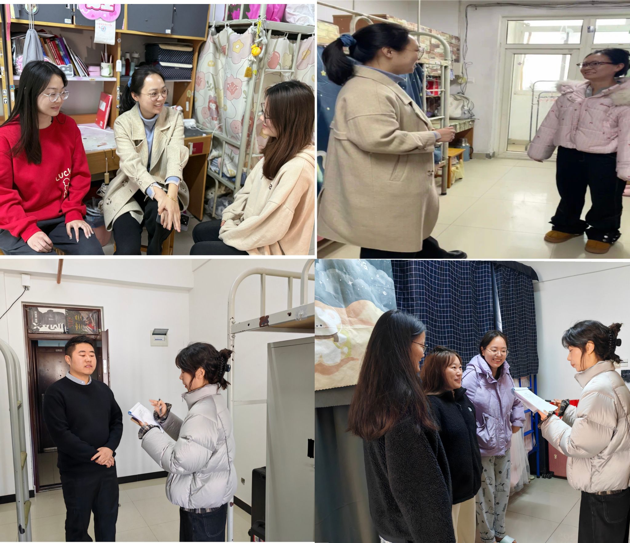2月22日-28日,辅导员队伍深入开展安全稳定风险排查工作,全面了解各类员工思想、学习和生活情况,及时展开隐患排查、登记和整治;围绕以往各种典型案例和学院当前存在的个别问题,有组织地开展会商和研讨,明确了工作思路,制定了工作方案。同时,各年级辅导员深入员工宿舍,了解新学期员工生活和学习中存在的问题,排查宿舍安全隐患,并就宿舍安全进行了重点强调。辅导员老师提醒同学们要加强身体锻炼,提高自身免疫力,抵御换季时节可能出现的流行性感冒等疾病;并要求同学们做好卫生值日,定期打扫宿舍卫生,常通风、勤消毒,注意保持宿舍内部整洁,为新学期的学习生活营造温馨整洁舒适的宿舍环境。