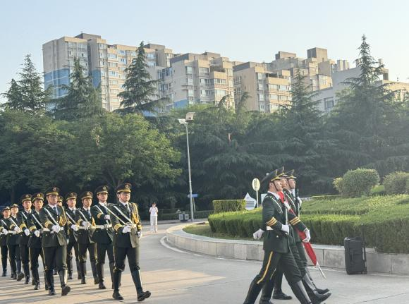 清晨7时整,升旗仪式在庄严氛围中拉开帷幕。国旗护卫队踏着铿锵有力的整齐步伐,将五星红旗护送至升旗台前。随着雄壮的国歌奏响,全体师生庄严肃立,向国旗行注目礼并齐声高唱国歌,目光追随着冉冉升起的五星红旗直至顶端。晨光中迎风舒展的国旗冉冉升起,与师生们炽热的爱国情怀交相辉映,在校园上空勾勒出壮丽的红色画卷。