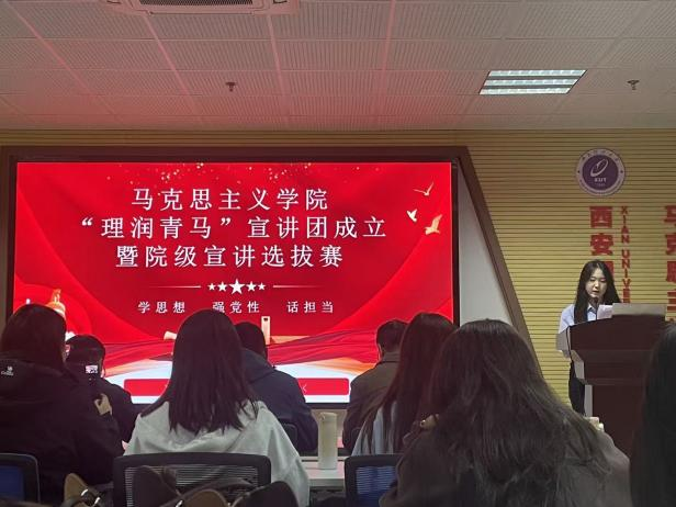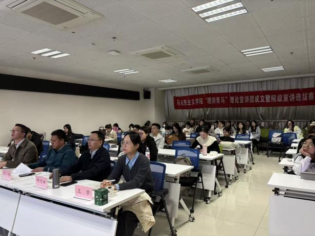 为深入学习贯彻习近平新时代中国特色社会主义思想,扎实推动党的创新理论在校园落地生根、开花结果,10月23日晚,公司在综南楼911报告厅隆重举行“理润青马”理论宣讲团成立仪式暨院级宣讲选拔赛。本次活动由公司员工社团——研究生基层党建服务队承办,活动邀请到公司党委副书记陈文林老师,中国近现代史纲要教研室王卫、潘胜强老师和院团委书记王梦老师出席担任评委;研究生基层党建服务队全体成员、2025级部分员工到场观摩学习。