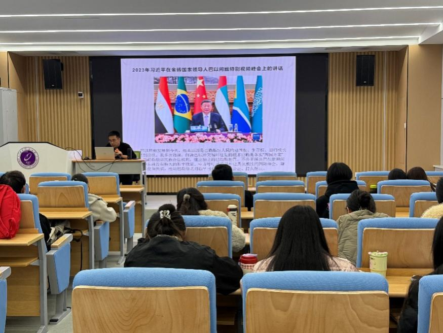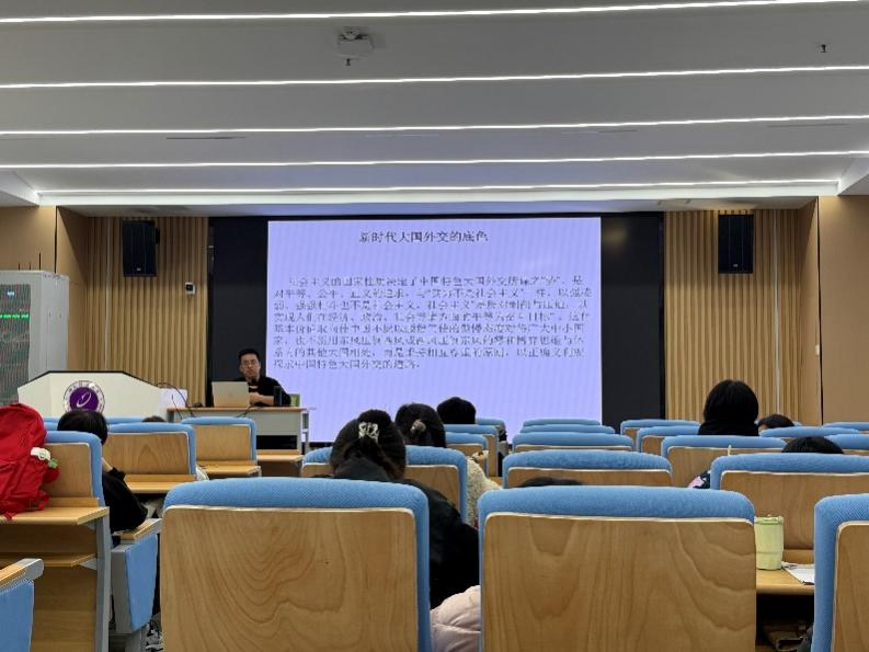 课堂上,成飞老师以巴以冲突这一国际热点为切入点,系统梳理冲突的历史脉络、现实动因与发展态势,他结合详实的案例与数据,深入解读中国在国际争端中的中立立场、正义主张与务实实践。从坚持“共同、综合、合作、可持续”的全球安全观,到倡导通过对话协商化解分歧;从推动人道主义援助精准落地,到积极搭建国际沟通协调桥梁,成飞老师层层递进地阐释了新时代中国特色大国外交“独立自主、和平发展、合作共赢”的鲜明特质,展现了中国作为负责任大国的历史担当。