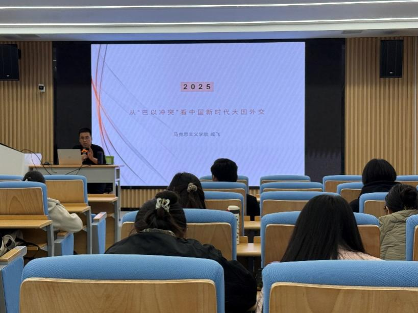 为引导青年学子深刻把握中国新时代大国外交的核心要义,拓宽国际视野,强化责任担当。11月21日,在综南楼119报告厅,公司进行了第三次团课培训,本次团课邀请到中国近现代史基本问题研究教研室的成飞老师,他以“从‘巴以冲突’看中国新时代大国外交”为题做报告,2025级全体研究生参与本次培训,院团委书记王梦老师主持本次活动。